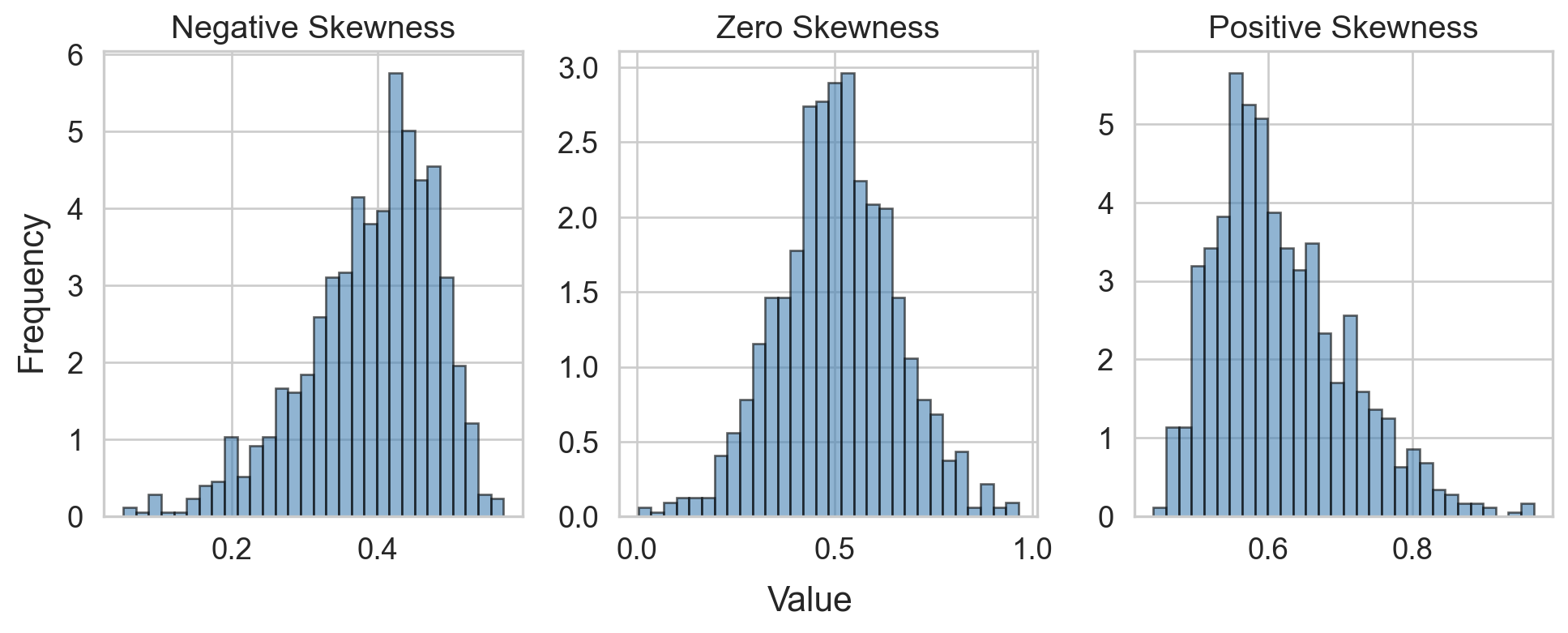 Skewness: Close to 0 for symmetry; Kurtosis: Close to 3 for normal “tailedness.”