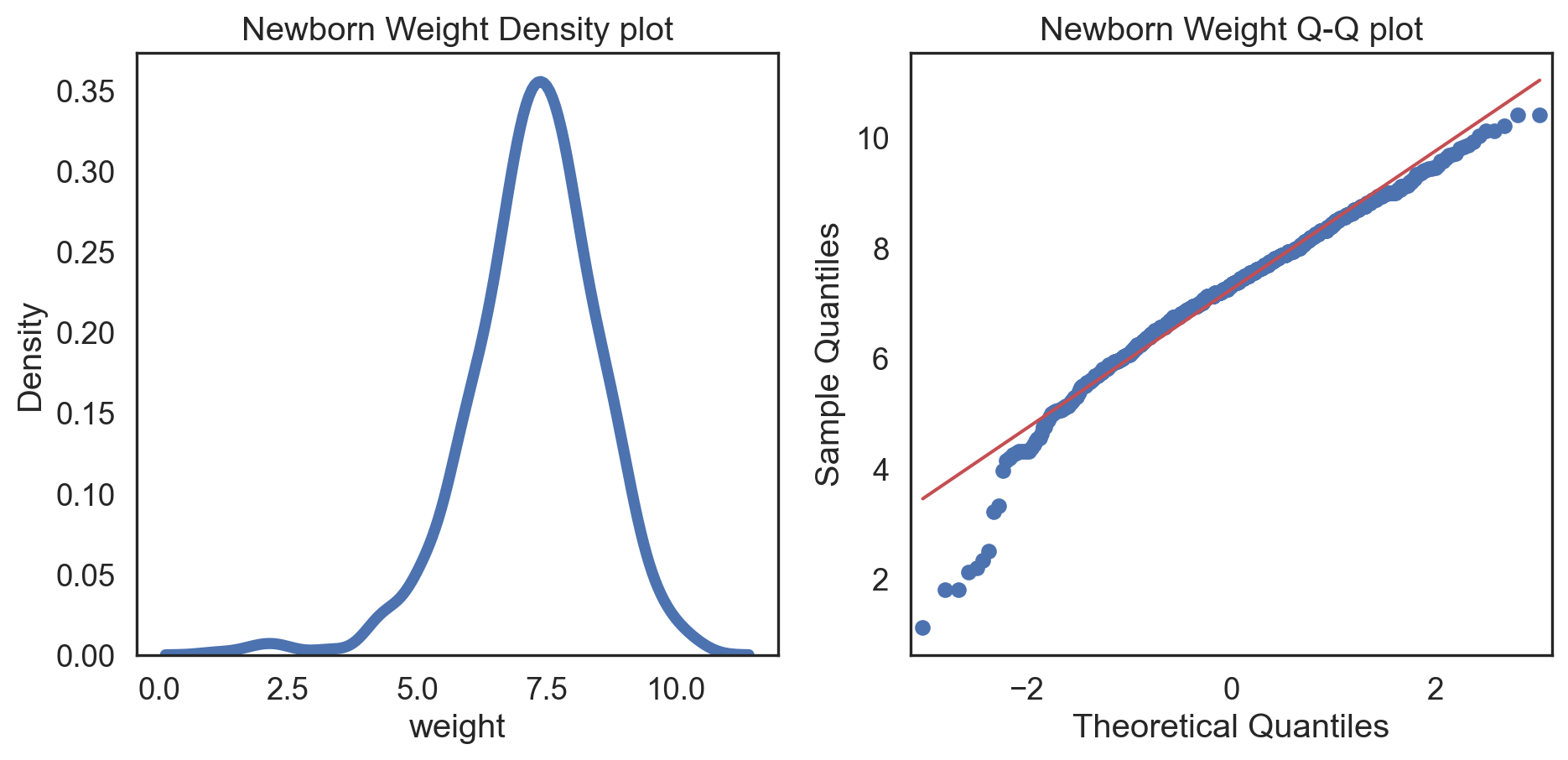 # Change theme to "white"sns.set_style("white")# Make a copy of the data dataCopy = births14.copy()# Remove NAsdataCopyFin = dataCopy.dropna()# Specify desired columni_col = dataCopyFin.weight# Subplotsfig, (ax1, ax2) = plt.subplots(ncols =2, nrows =1)# Density plotsns.kdeplot(i_col, linewidth =5, ax = ax1)ax1.set_title('Newborn Weight Density plot')# Q-Q plotsm.qqplot(i_col, line='s', ax = ax2)ax2.set_title('Newborn Weight Q-Q plot')plt.tight_layout()plt.show()