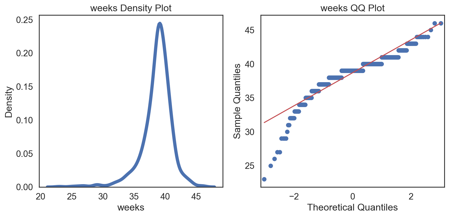 # Change theme to "white"sns.set_style("white")# Make a copy of the data dataCopy = births14.copy()# Select only numerical columnsdataRed = dataCopyFin.select_dtypes(include=np.number)# Fill the subplotsfor k in dataRed.columns:# Create a figure with two subplots fig, (ax1, ax2) = plt.subplots(ncols =2, nrows =1)# Density plot sns.kdeplot(dataRed[k], linewidth =5, ax = ax1) ax1.set_title(f'{k} Density Plot')# Q-Q plot sm.qqplot(dataRed[k], line ='s', ax = ax2) ax2.set_title(f'{k} QQ Plot') plt.tight_layout() plt.show()