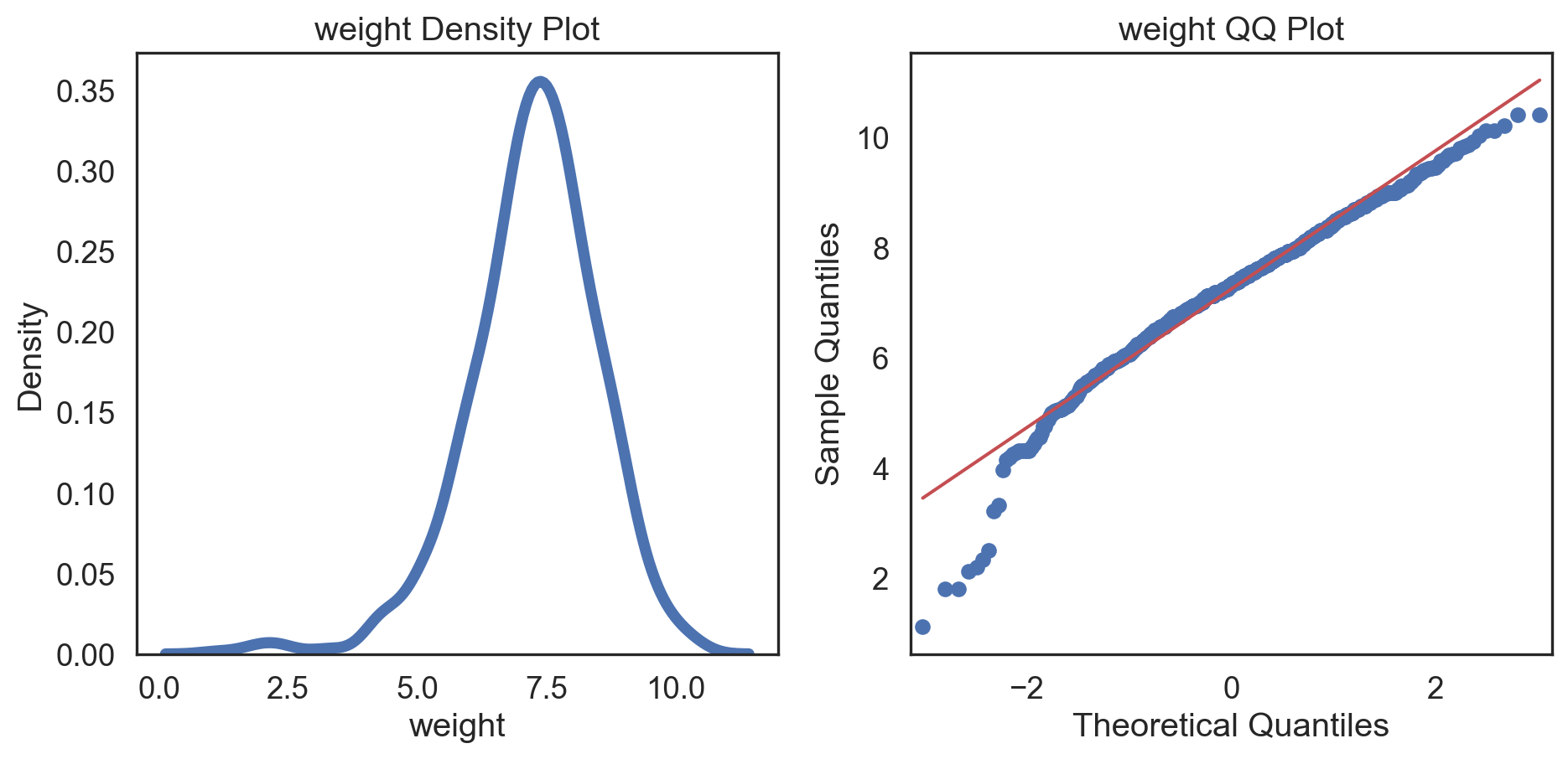 weight q25 = 6.545 q75 = 8.0 IQR = 1.455
