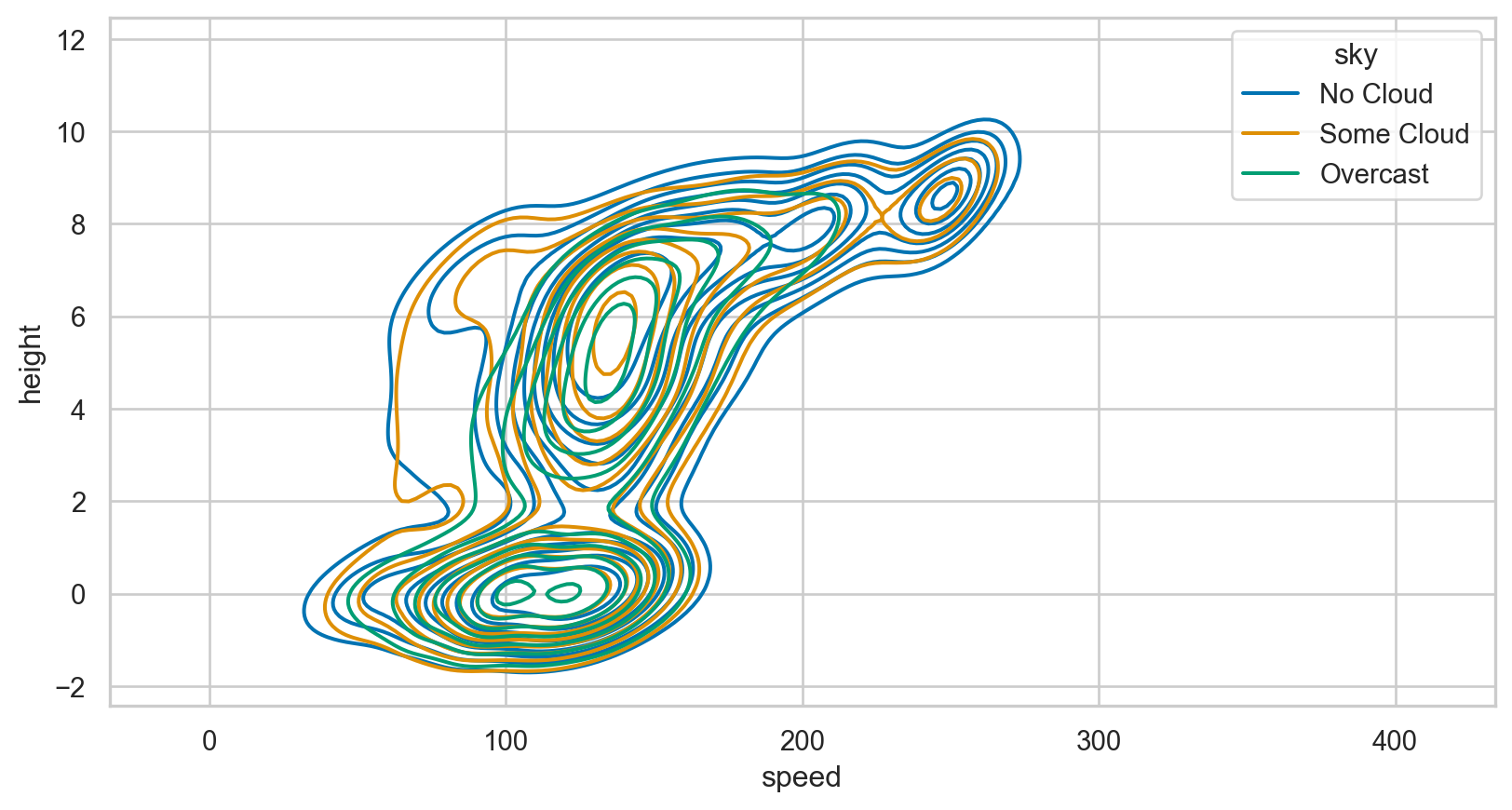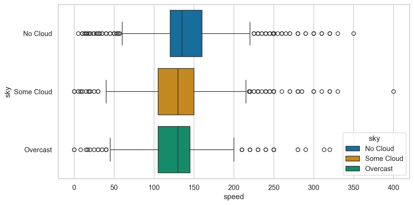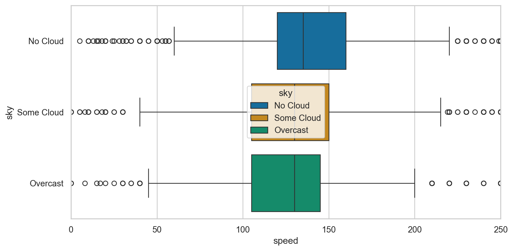 sns.set_style("whitegrid")p1 = sns.boxplot(data = birds, x ="speed", y ="sky", hue ="sky", palette ="colorblind")p1.set_xlim(0, 250)plt.show()