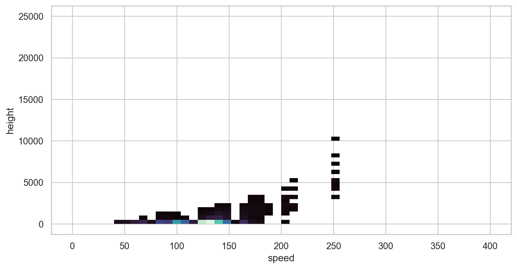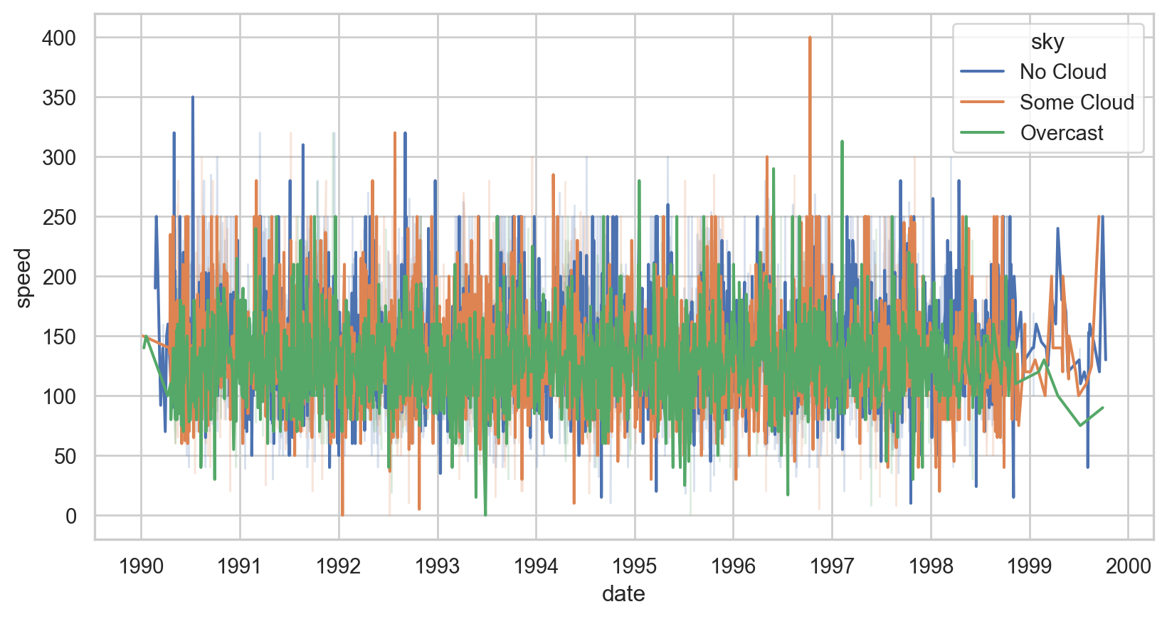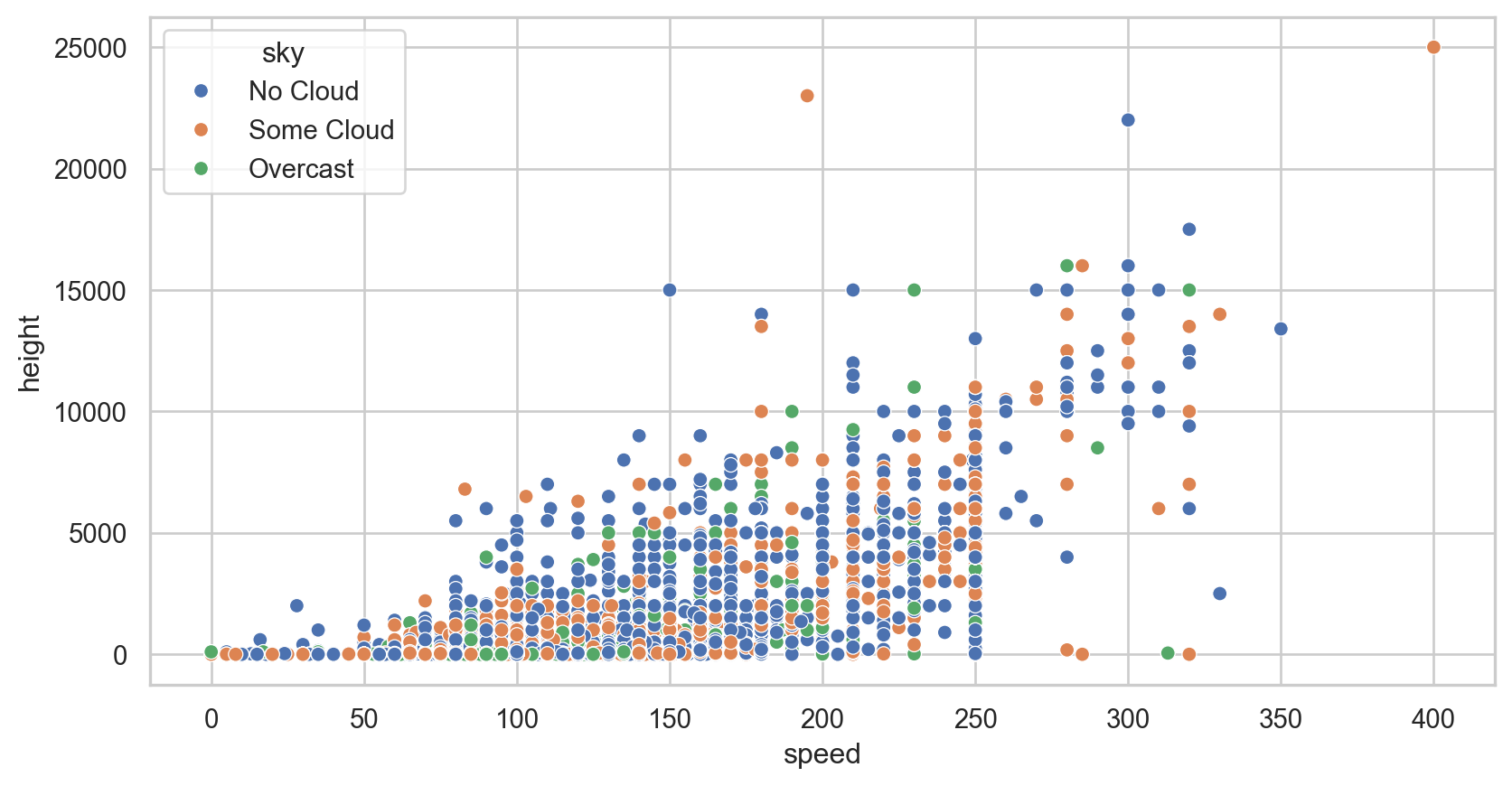 sns.set_style("whitegrid")p1 = sns.boxplot(data = birds, x ="speed", y ="sky", hue ="sky", palette ="colorblind")p1.set_xlim(0, 250)plt.show()