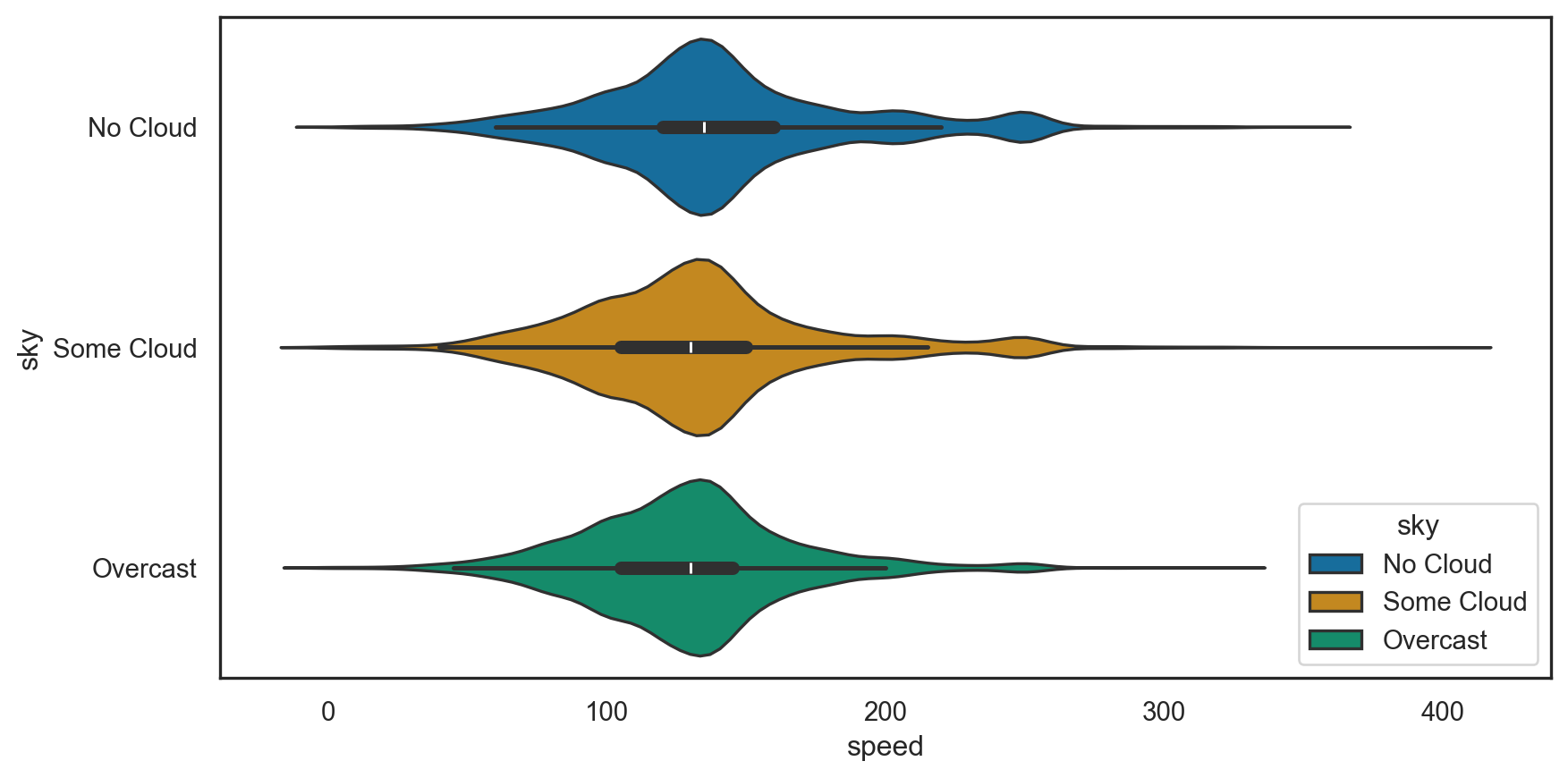 sns.set_style("white")sns.violinplot(data = birds, x ="speed", y ="sky", hue ="sky", palette ="colorblind")plt.show()