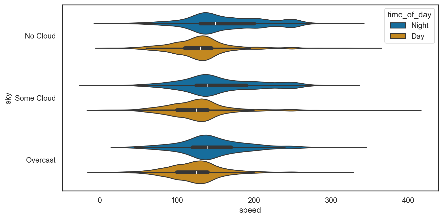 sns.set_style("white")options = ['Night', 'Day']birds_filt = birds[birds['time_of_day'].isin(options)]sns.violinplot(data = birds_filt, x ="speed", y ="sky", hue ="time_of_day", palette ="colorblind")plt.show()