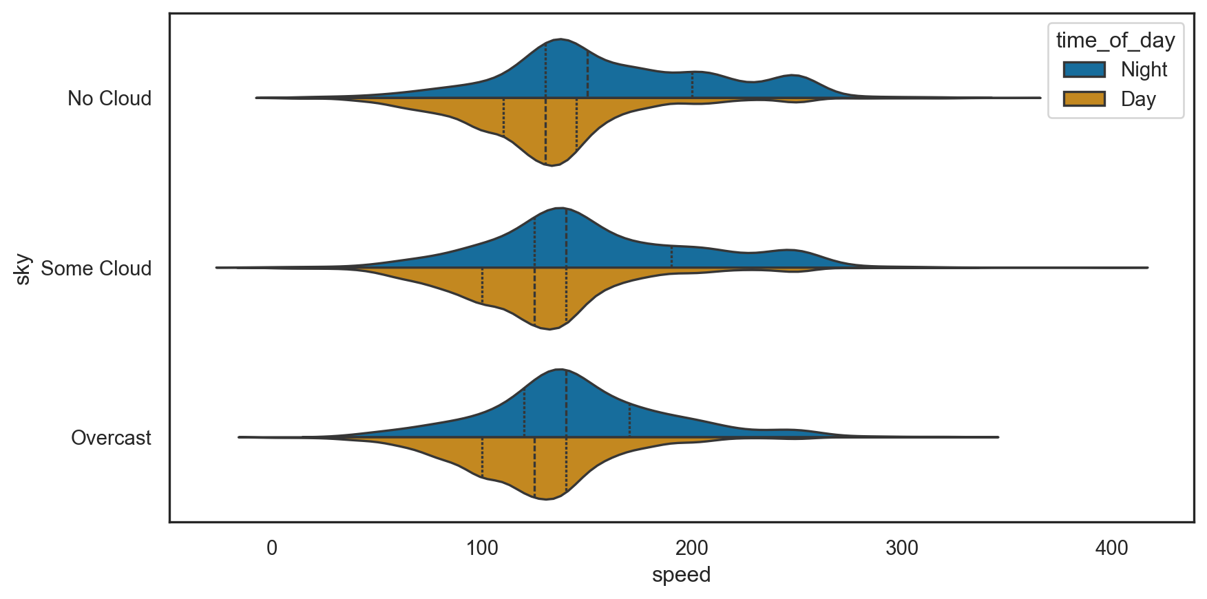 sns.set_style("white")sns.violinplot(data = birds_filt, x ="speed", y ="sky", hue ="time_of_day", palette ="colorblind", inner ="quart", split =True)plt.show()