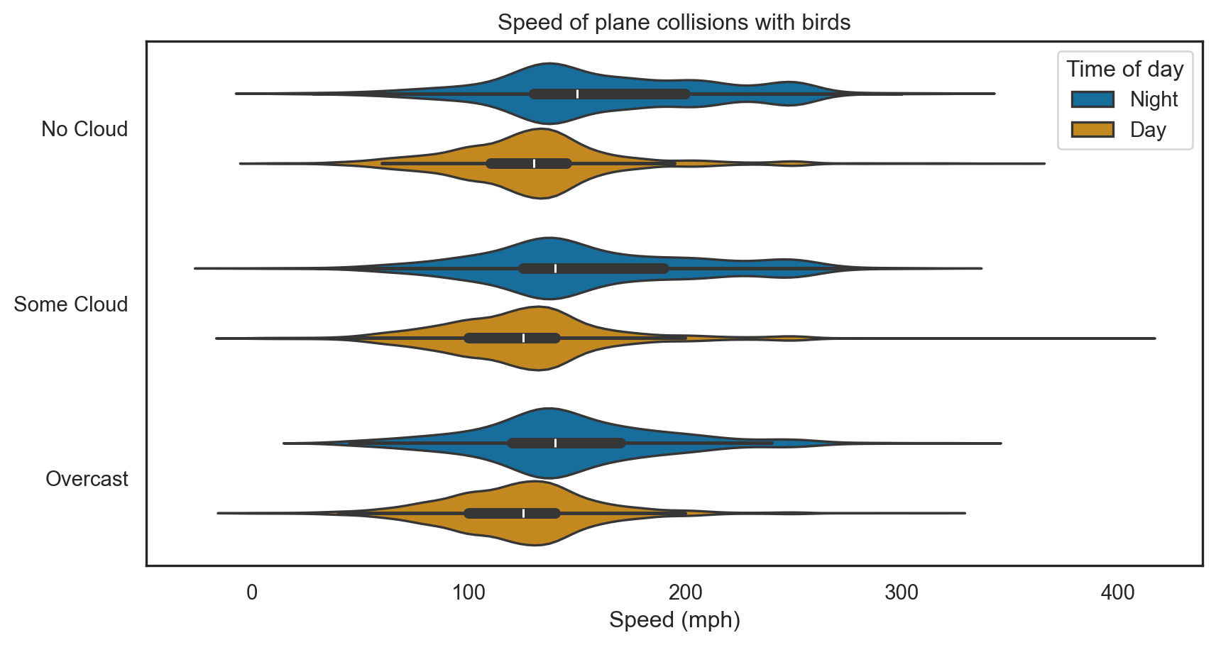sns.set_style("white")g1 = sns.violinplot(data = birds_filt, x ="speed", y ="sky", hue ="time_of_day", palette ="colorblind")g1.set(xlabel ="Speed (mph)")g1.set(ylabel =None)g1.set(title ="Speed of plane collisions with birds")g1.legend(title ="Time of day")plt.show()